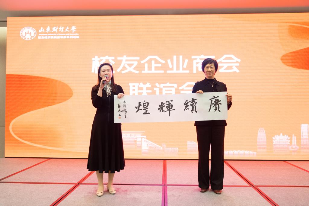 联谊阶段,艺术学院高远副教授现场创作书法作品《赓续辉煌》赠予校友企业家商会,18级校友王子怡演唱了《光阴的故事》,体育学院、金融学院的几位同学表演了精彩的节目。