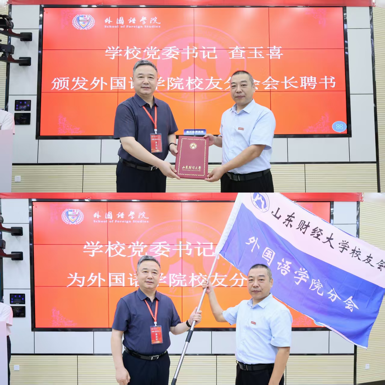 查玉喜为学院校友分会授旗,并向于秀金颁发会长聘书。