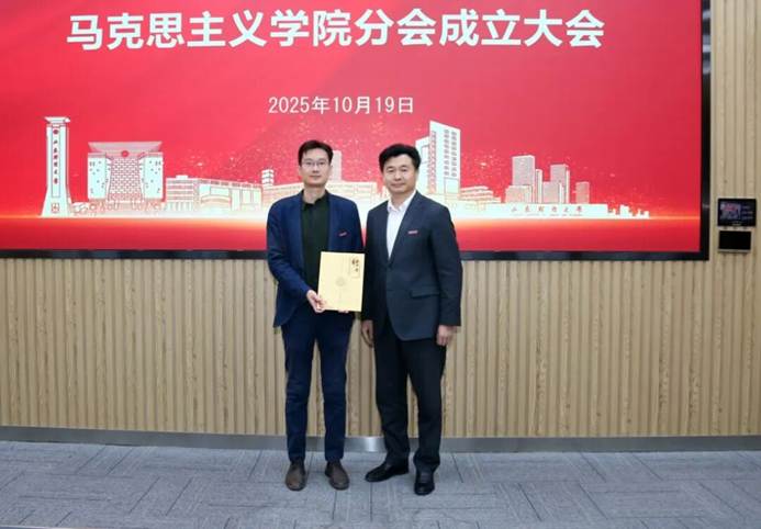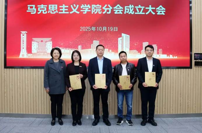 在热烈的掌声中,张红霞为马克思主义学院分会授旗,并向负责人颁发聘书。