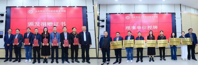 张新为捐赠校友代表颁发捐赠证书。学院负责人为7家校友企业授予分会理事单位牌匾。
