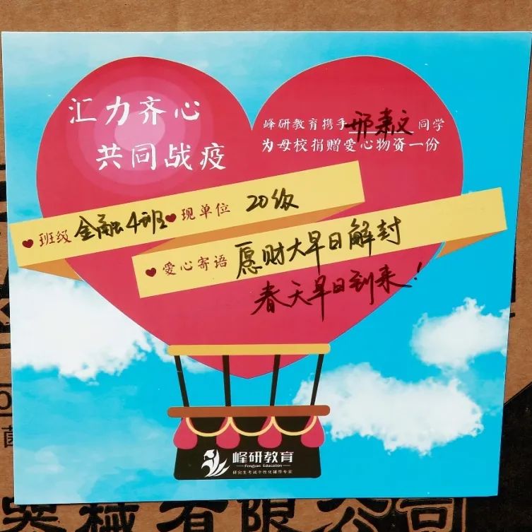 “爱和希望比病毒蔓延的更快,总有温暖的人会让春天早点儿到来”、“祝愿山财大积历史之厚蕴,宏图耕战再谱华章!”一句句感人心扉的爱心卡片传递着捐赠校友对母校的牵挂和祝福,与捐赠的物资一同送到学校,为母校老师们加油鼓劲!