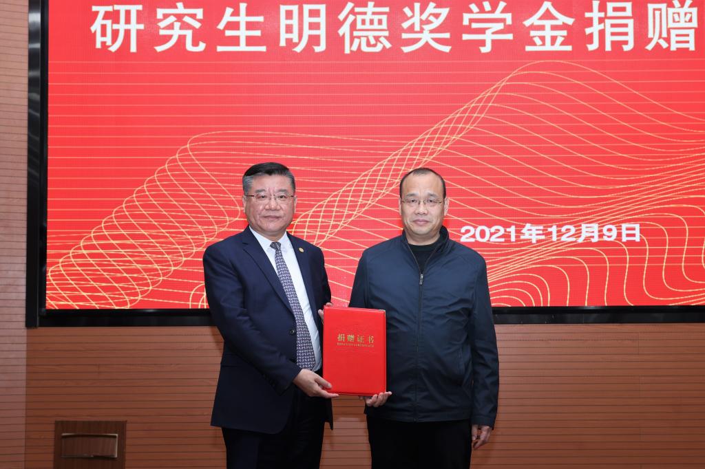 12月9日下午,山东财经大学研究生“明德奖学金”捐赠暨颁发仪式在燕山校区逸夫楼报告厅隆重举行。颁奖仪式前,党委书记王邵军会见了山东明德物业管理集团有限公司董事长刘德明一行。副校长张培国参加会见并出席仪式。