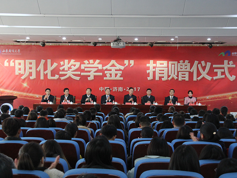 2017年12月8日下午,“明化奖学金”捐赠仪式在圣井校区举办。学校党委副书记车滨、山东明化投资控股集团有限公司董事长孙洪海、章丘区大学园区管理服务中心主任张永仕、明化集团副总经济师兼人力资源中心主任付安平、章丘区大学园区管理服务中心副主任崔式敬以及学校学生工作处、圣井校区管理办公室相关负责人等出席捐赠仪式。明化集团以及学校相关学院和部分职能部门负责同志,教师代表、学生代表等300余人参加活动。