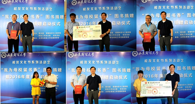 2016年6月3日下午,山东财经大学首届校友文化节之2016年度捐赠启动仪式、“我为母校留书香”图书捐赠仪式、校友书画、摄影创作展开展仪式在燕山校区举行,副校长聂培尧、管理科学与工程学院、艺术学院、图书馆、退离休工作处、校友工作办公室等相关单位负责人及济南金澍民间融资登记服务公司董事长高涛、山东中明会计师事务所有限公司董事长巴树青、济南任我行汽车俱乐部董事长霍海东、管理科学与工程学院校友会会长郭军等校友代表出席活动。相关学院、单位教工、学生代表、校友工作志愿者协会成员代表参加了活动。校友代表向学校进行了捐赠,聂培尧代表学校接收捐赠并致辞。