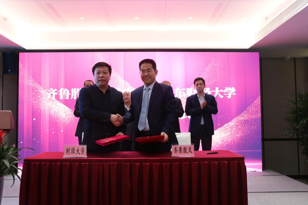 2021年11月11日,山东财经大学与齐鲁股权交易中心合作协议签署暨山东财经大学产教研融合研究生联合培养示范基地、大学生社会实践基地揭牌仪式举行。中泰证券党委常委、党委副书记吕祥友,山东省地方金融监督管理局监管四处处长刘博、齐鲁股权交易中心党委书记、董事长王胜进,齐鲁股权交易中心总裁李学锋和我校副校长张新出席签约仪式并进行座谈。