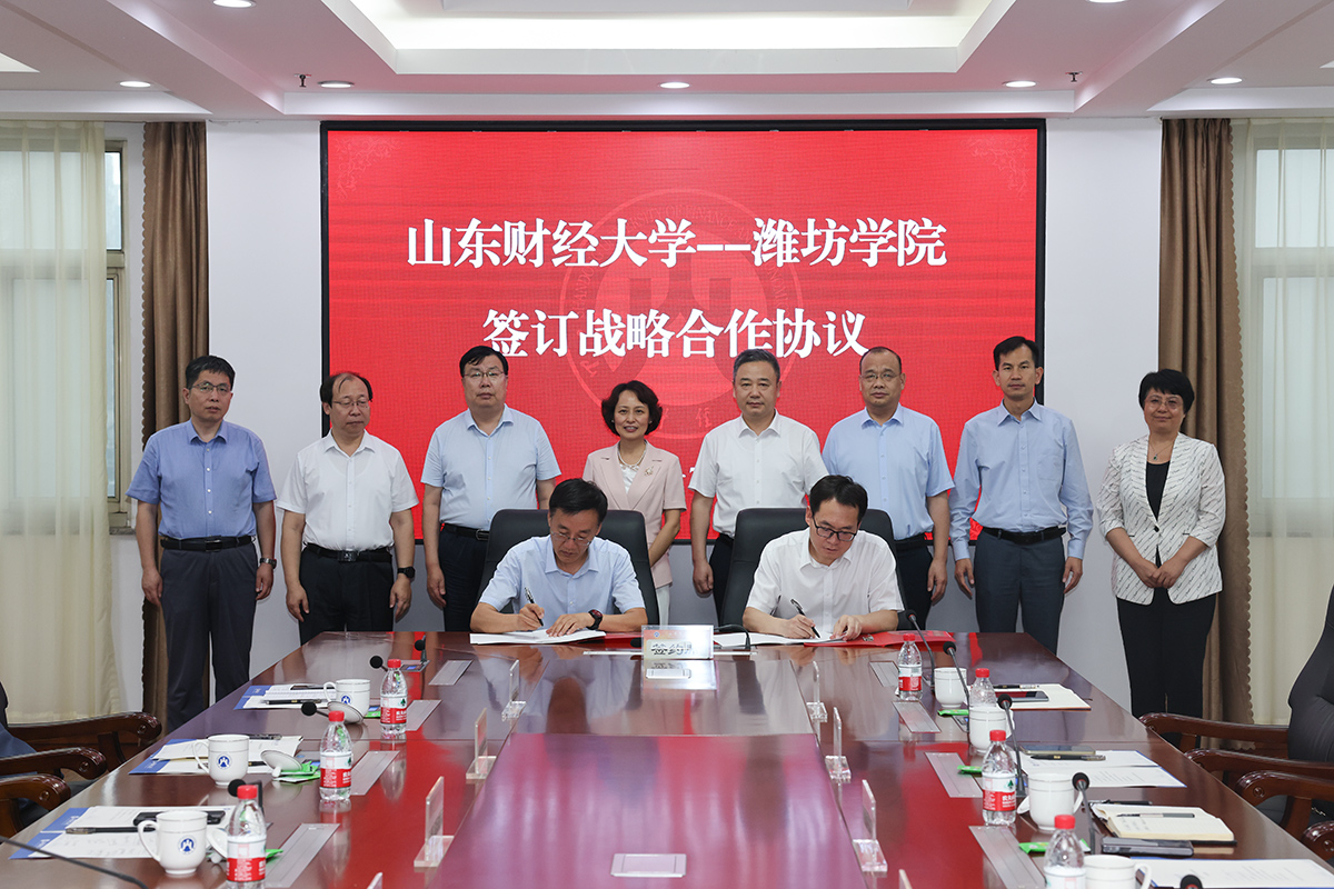 7月5日下午,潍坊学院党委书记徐梅,校长来逢波,副校长王成端、李英德、苗金春、赵卫红一行来我校访问交流。校党委书记查玉喜,校长洪俊杰,校党委副书记张培国、谢申祥在燕山校区会见来宾并座谈交流。洪俊杰、来逢波共同签署“山东财经大学—潍坊学院战略合作协议”。