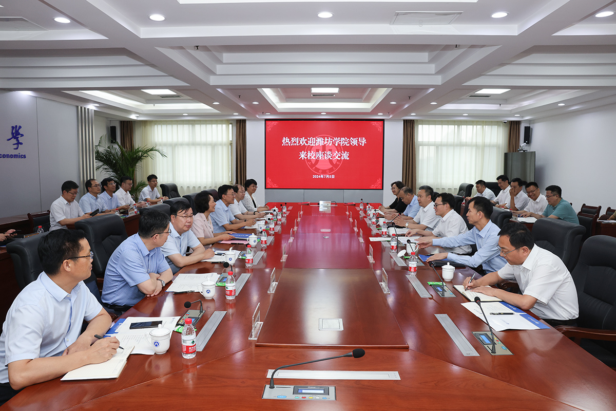 洪俊杰从办学历史、学科建设、人才培养、科学研究、师资引培、国际交流、校友工作等方面介绍了我校发展现状,重点介绍了近期在博士学位授权点建设、人工智能赋能教育教学改革“421”行动计划、中国经济研究院、推进毕业生就业等工作进展。他希望与潍坊学院通过密切合作交流,发挥各自比较优势,互惠共赢,助力山东高等教育高质量发展。